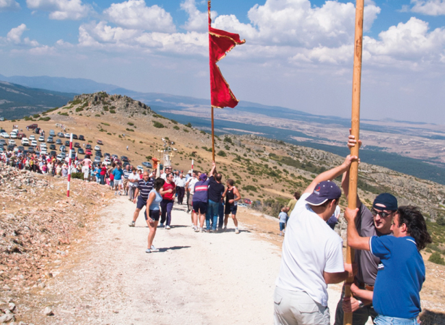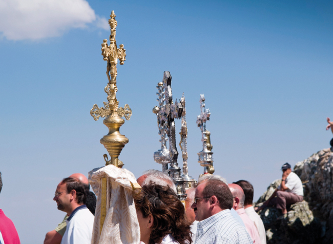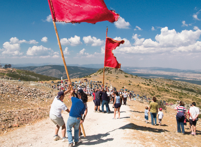 Por la mañana los romeros de los vecinos pueblos de la Serranía, como Bustares, Albendiego, Aldeanuela de Atienza, El Ordial, Gascueña de Bornova, las Navas de Jadraque y Prádena de Atienza suben hasta la ermita con sus cruces procesionales y rojas banderas, las cuales deben ser portadas entre varios hombres dado el continuo y fuerte viento que azota estas latitudes serranas.