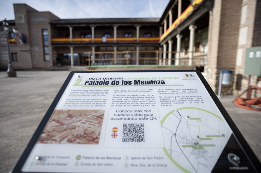 Ya en la comarca de La Campiña, hacemos parada en Yunquera de Henares, en cuya Plaza Mayor se puede admirar la galería de dos plantas con columnas clásicas de piedra, sobre las que aún quedan algunos capiteles alcarreños con escudos. Es lo que se conserva de la estructura original del palacio renacentista, construido en torno a 1525 a instancias de Francisco Laso de Mendoza, rama mendocina de los Señores de Yunquera, como atestiguan los escudos de armas de los Mendoza y Luna que aún se conservan. Actualmente, el Palacio, al que está adosado la Casa Consistorial, se usa como biblioteca municipal.