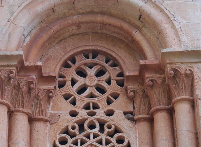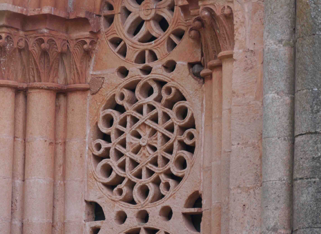 El ábside principal es semicircular, con tres ventanales decorados con caladas celosías de piedra tallada que ofrecen espléndidos dibujos geométricos de raíz mudéjar. Las capillas laterales tienen igualmente ventanales consistentes en óculos moldurados con calada celosía central, con composición geométrica y cruz de ocho puntas.