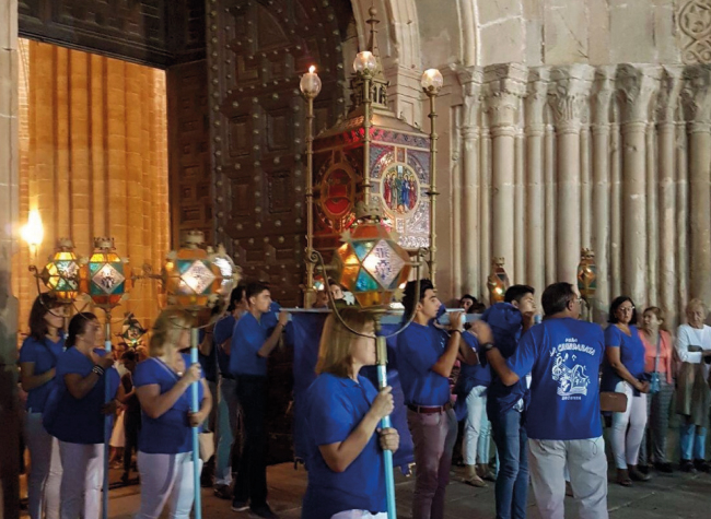 La talla del s. XIII procesiona en una carroza adornada con flores, seguida de cinco misterios elaborados en metal y cristal, sobre las andas portadas a hombros por los fieles.