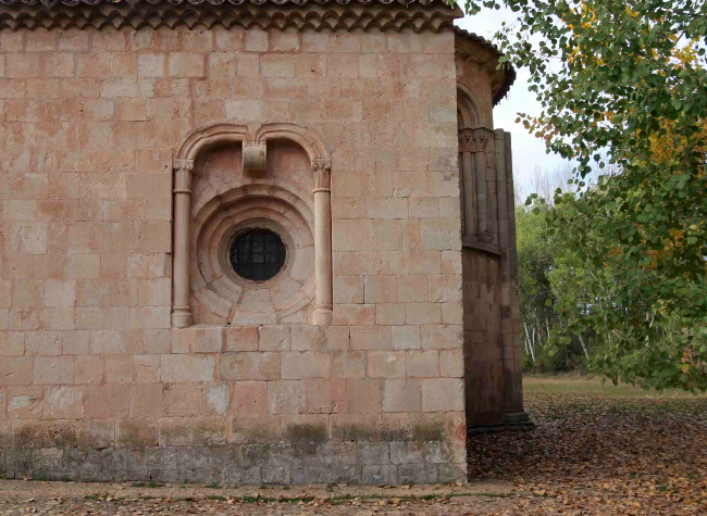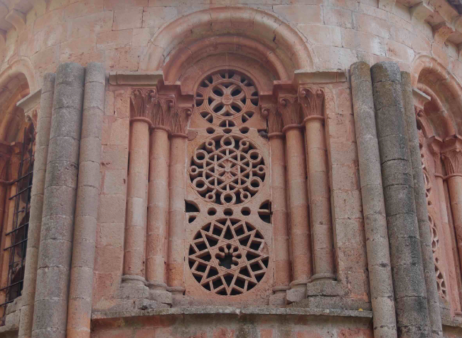El ábside principal es semicircular, con tres ventanales decorados con caladas celosías de piedra tallada que ofrecen espléndidos dibujos geométricos de raíz mudéjar. Las capillas laterales tienen igualmente ventanales consistentes en óculos moldurados con calada celosía central, con composición geométrica y cruz de ocho puntas.