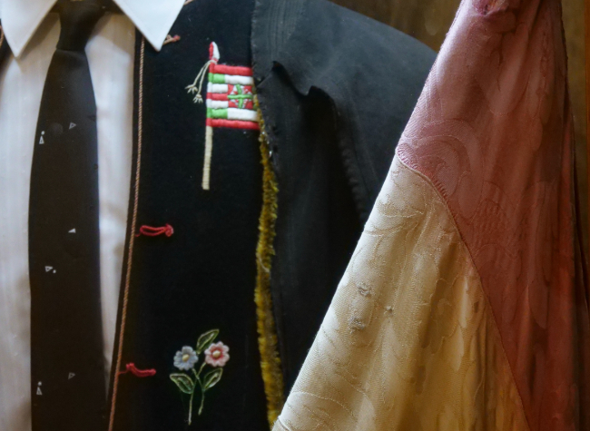 Nada más entrar, dos elementos que la distinguen son perceptibles por el visitante: la bandera y la indumentaria de los cofrades, con sus colores característicos y su chaquetilla que identifica a sus miembros cada Domingo de Pentecostés en Atienza.